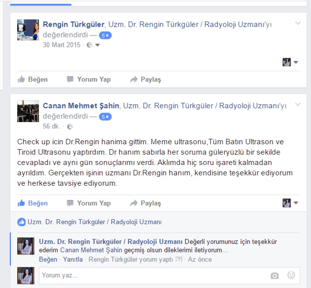 Check up icin Dr.Rengin hanima gittim. Meme ultrasonu,Tüm Batın Ultrason ve Tiroid Ultrasonu yaptırdım. Dr hanım sabırla her soruma güleryüzlü bir sekilde cevapladı ve aynı gün sonuçlarımı verdi. Aklımda hiç soru işareti kalmadan ayrıldım. Gerçekten işinin uzmanı Dr.Rengin hanım, kendisine teşekkür ediyorum ve herkese tavsiye ediyorum.